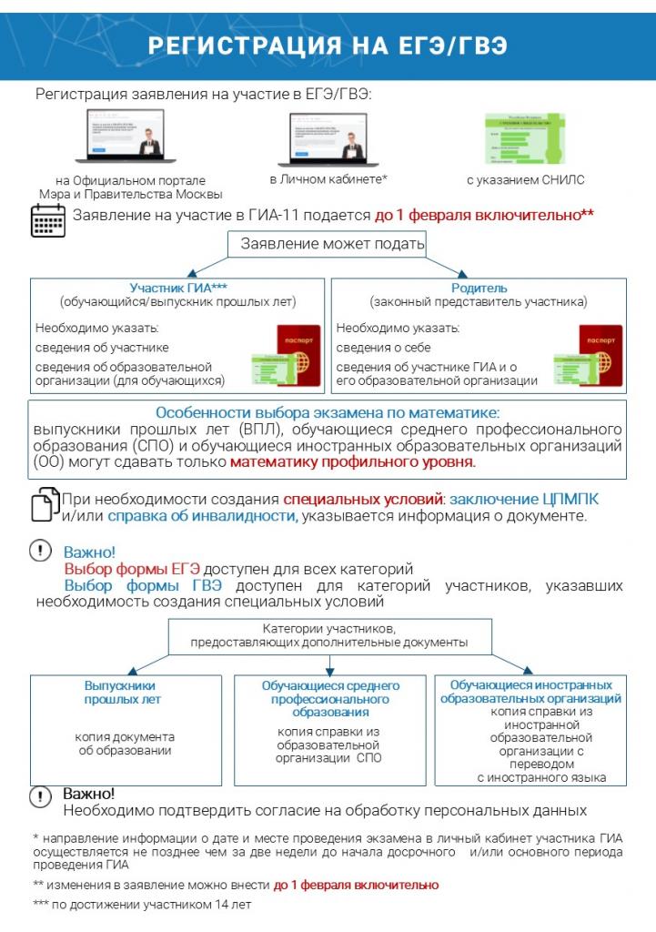 Подача заявления на участие в едином государственном экзамене (ЕГЭ) и государственном выпускном экзамене (ГВЭ) осуществляется на Официальном сайте Мэра и Правительства Москвы (mos.ru) до 1 февраля включительно.